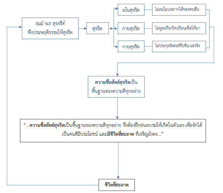 การดำเนินชีวิตด้วยหลัก “สุจริตธรรม” หรือ “ความซื่อสัตย์สุจริต” อันเป็นแนวทางที่พระพุทธเจ้าทรงย้ำเตือนให้พุทธศาสนิกชนได้ตระหนักรู้ว่า การดำรงตนอยู่ในครรลองของสุจริตธรรมนั้น ธรรมะจะรักษาที่คนที่คิด พูด และทำอย่างสุจริตให้มีความสุขทั้งในโลกนี้ และโลกอื่น ตลอดเวลาในการดำเนินชีวิต และความซื่อสัตย์สุจริตจะเป็นพื้นฐาน หรือตัวชี้วัดความดีงามในการใช้ชีวิตร่วมกันกับคนอื่นๆ ในสังคม