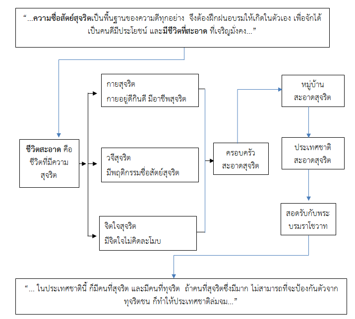ด้วยเหตุดังกล่าว คำว่า “ชีวิตสะอาด” จึงเกิดขึ้นบนฐานของความสุจริตทั้งมิติของความสุจริตทั้งมิติของกายที่สุจริตไม่แสดงออกถึงการคดโกงทุจริต (กายสุจริต) การไม่ใช่วาจาบิดเบือน หรือสื่อสารเพื่อให้มาซึ่งสิ่งต่างๆ ที่มิควรมีควรได้ (วจีสุจริต) และการไม่คิดมุ่งหวังที่จะได้ประโยชน์เพื่อหาช่องทางแย่งชิง หรือทุจริตคิดคด (มโนสุจริต) การพัฒนาชีวิตที่สะอาดจึงจำเป็นต้องเริ่มต้นจากการพัฒนากลุ่มบุคคลเชิงปัจเจกในครอบครัว คือ “พ่อ แม่ และลูก” เพื่อให้มีชีวิตสะอาด เมื่อนั้น ครอบครัวเหล่านั้นจะสะอาด ความสะอาดของแต่ละครอบครัวย่อมส่งผลทำให้หมู่บ้านสะอาด อันจะต่อเนื่องไปสู่สังคม ประเทศชาติ และโลกสะอาดมากยิ่งขึ้นอันมีผลมาจากชีวิตของแต่ละคนในครอบครัวสะอาด ดังจะเห็นได้จากภาพดังนี้