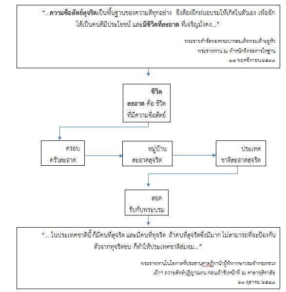 จากแผนภูมิข้างบนจะพบประเด็นของการพัฒนาหมู่บ้านช่อสะอาดดังที่ได้กล่าวแล้วในเบื้องต้นว่า มีจุดเริ่มต้นมาจากพระราชดำรัสของพระบาทสมเด็จพระเจ้าอยู่หัวที่มีจะเห็น “ชีวิตสะอาดคือชีวิตที่มีความซื่อสัตย์สุจริต” และหากขยายความของความว่า “ซื่อสัตย์สุจริต” นั้น หมายถึง ความสุจริตทั้งกาย พฤติกรรม จิตใจ และปัญญา เพราะเมื่อกายมีอาชีพที่สุจริต พฤติกรรมไม่มุ่งแย่งชิง หรือทุจริตคดโกง จิตใจไม่ละโมบโลภมาก และปัญญาที่ไม่แสวงหาช่องทางทุจริต ย่อมส่งผล ความสุจริตของครอบครัว ทั้งพ่อ แม่ และลูกด้วย ความสะอาดของแต่ละครอบครัวจึงส่งผลต่อความสะอาดของหมู่ในภาพรวมอันเป็นหน่วยนับรวมของครอบครัว และจะส่งผลต่อสังคม ประเทศชาติให้มีความสะอาดต่อไป ดังนั้น หากหมู่บ้านสะสมความสะอาด ซื่อสัตย์สุจริตได้มากขึ้น ย่อมส่งผลต่อต่อประเทศชาติในฐานะที่จะมีภูมิคุ้มกันการทุจริตคดโกงต่อไป